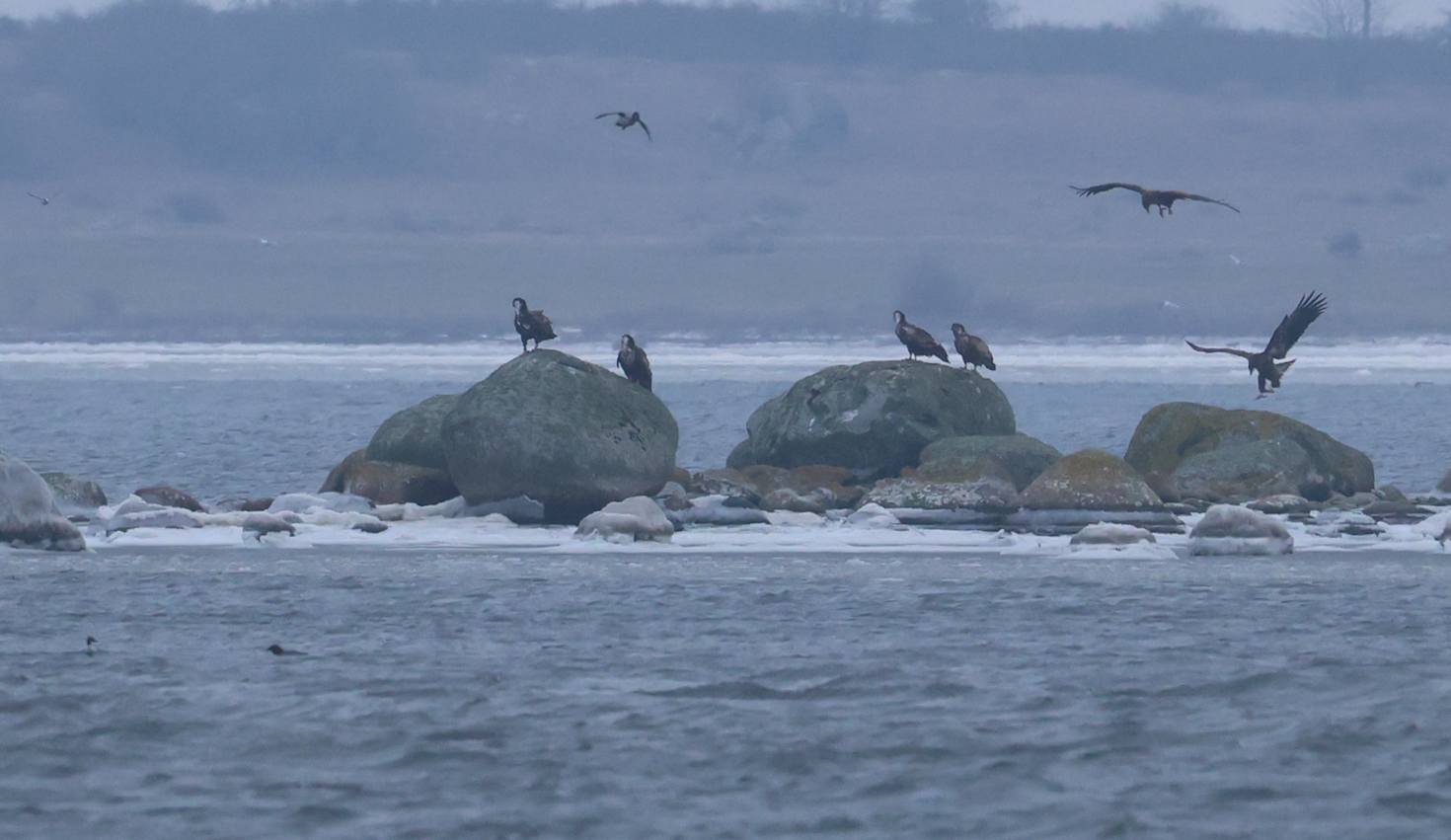 Vi bedömer att cirka 12 havsörnar besökte matningen med omnejd under förmiddagen. Det var inte oväntat då det går så bra för havsörnarna att den numera inte längre är rödlistad. Värre är det för kungsörnarna som har det besvärligare. Det är dessutom bara undantagsvis som kungsörn besöker den utlagda maten. Vi passade naturligtvis också på att ropa ut andra intressanta fåglar som sågs. Det kan nämnas salskrake, blå kärrhök, sidensvans och stare.